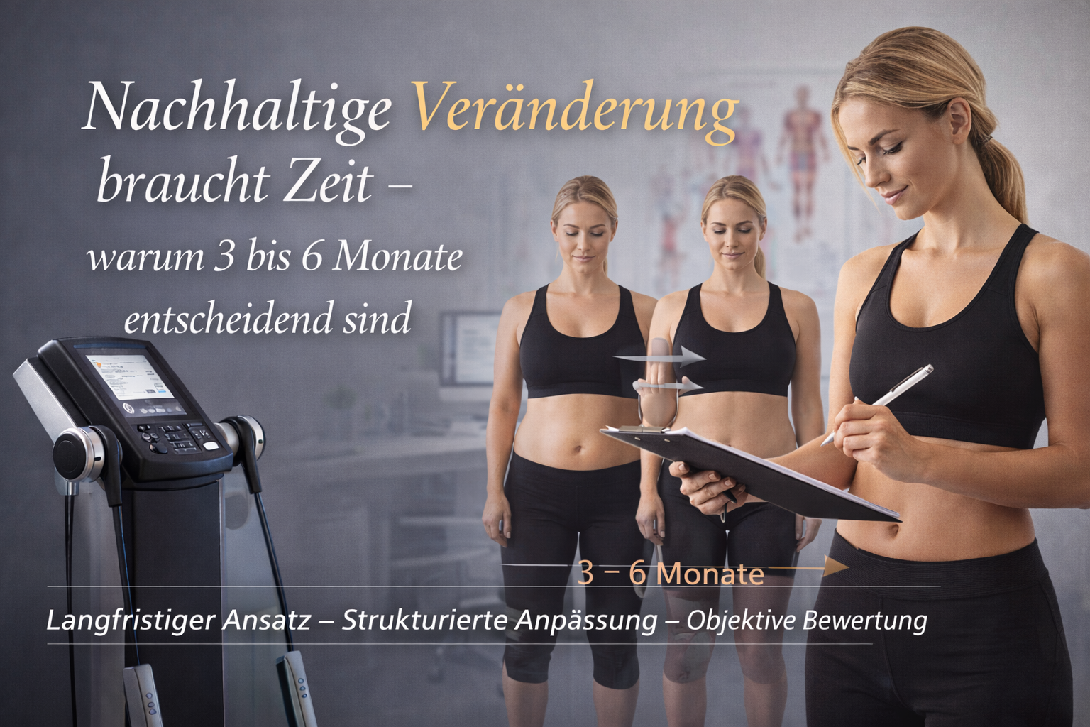 Veränderungen der Körperzusammensetzung – insbesondere Reduktion von Fettmasse und Aufbau oder Erhalt von Muskelmasse – entwickeln sich graduell.